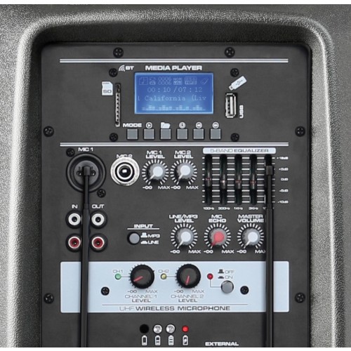 Un système professionnel 12“, 600 W avec télécommande et port USB et SD pour lire des fichiers audio MP3. Ce système “tout en un“ possède un récepteur BT pour streaming audio et un émetteur de poche UHF. Alimentation sur secteur ou sur accu 12 V intégré, pour une utilisation possible en extérieur. Avec poignée rétractable et roulettes. Sur la face arrière, 2 entrées micro et effet Echo pour les micros filaires, entrée AUX Ligne, zone de commande MP3, réglage graves et aigus... Ce système est indispensable partout où une bonne reproduction audio est souhaitée.