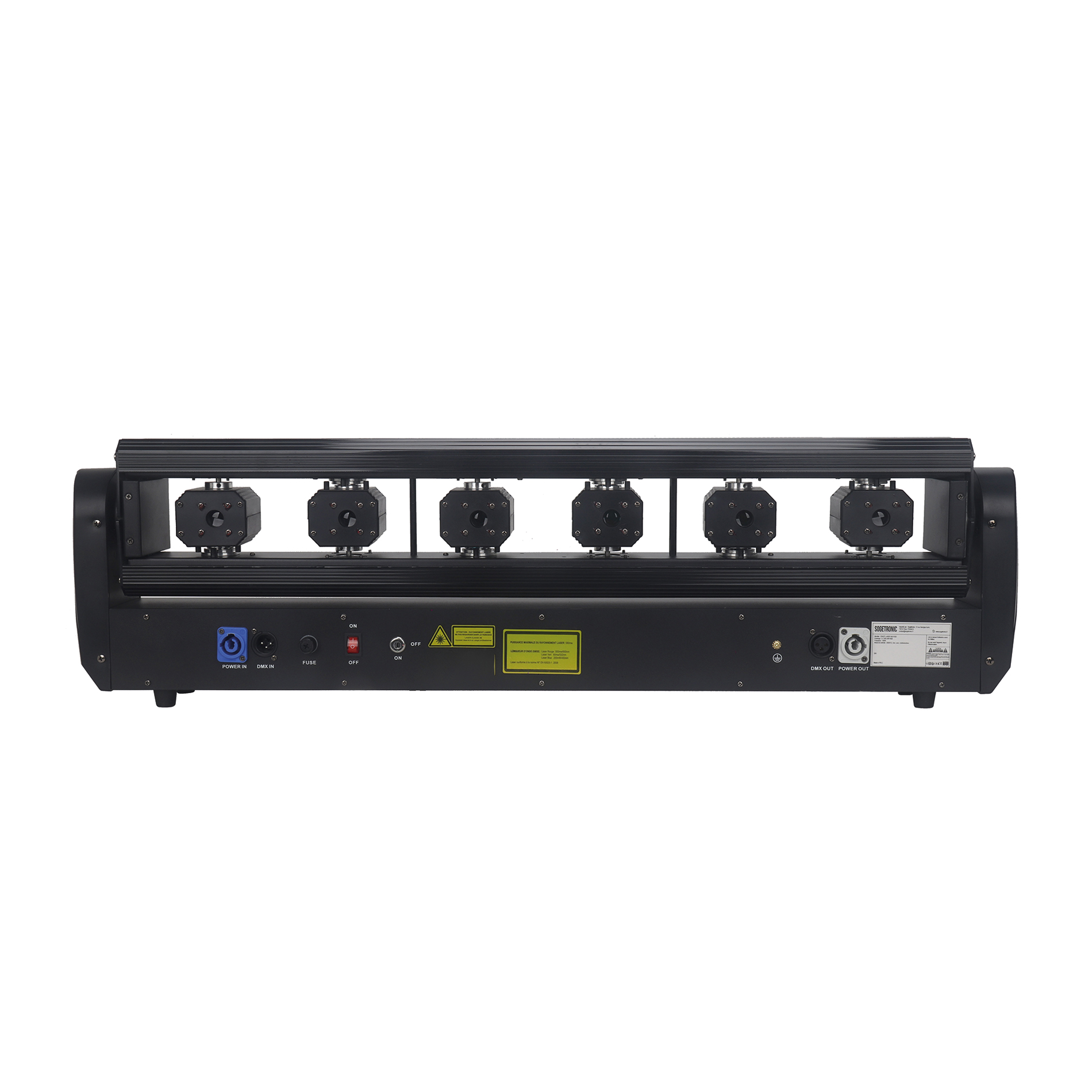- Lasers : 6 x Diodes lasers RGB de 500mW (rouge 300mW – Bleu 200mW – Vert 80mW)