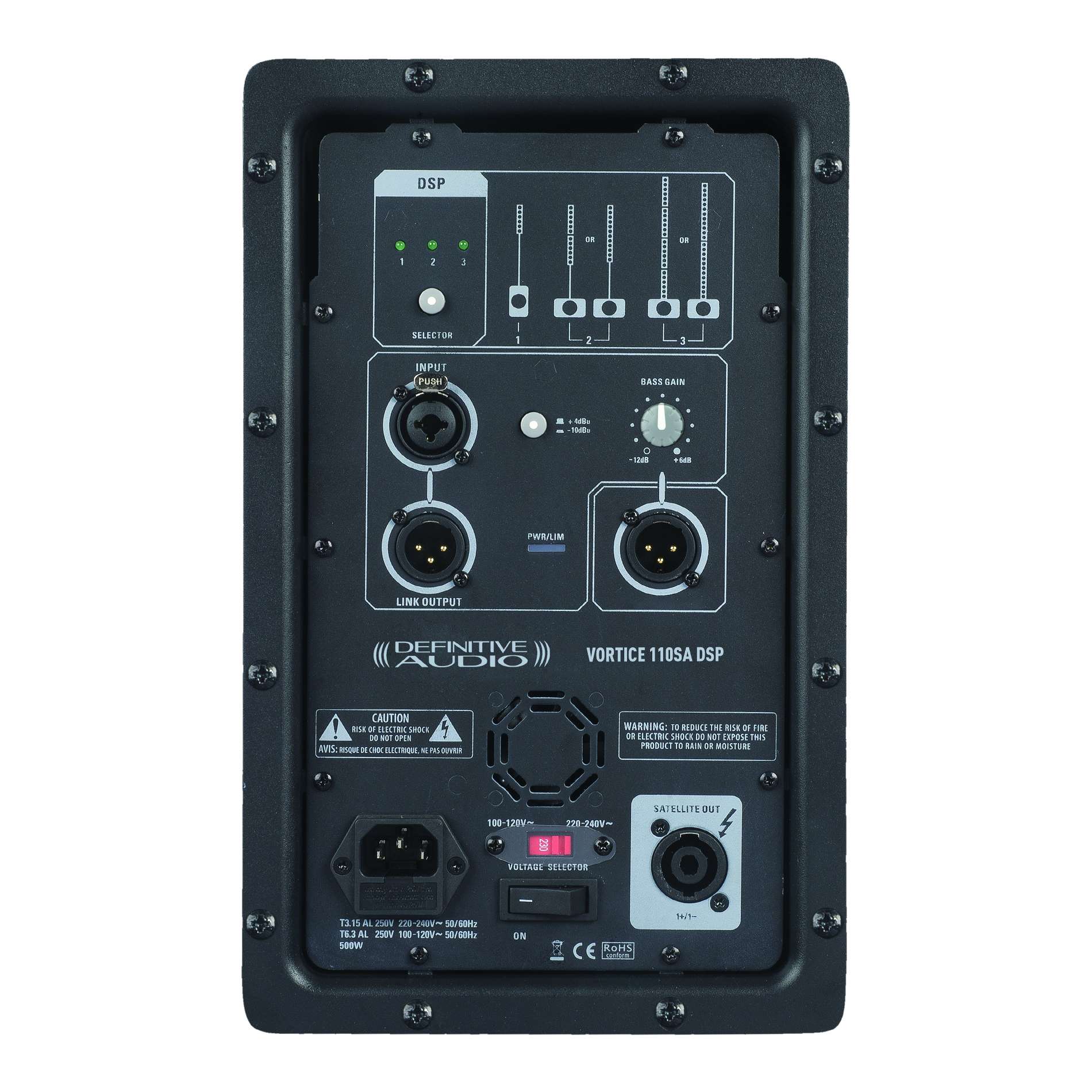 - Sorties : XLR symétrique, XLR link pour caisson Vortice 110SA et speakon pour colonnes Vortice