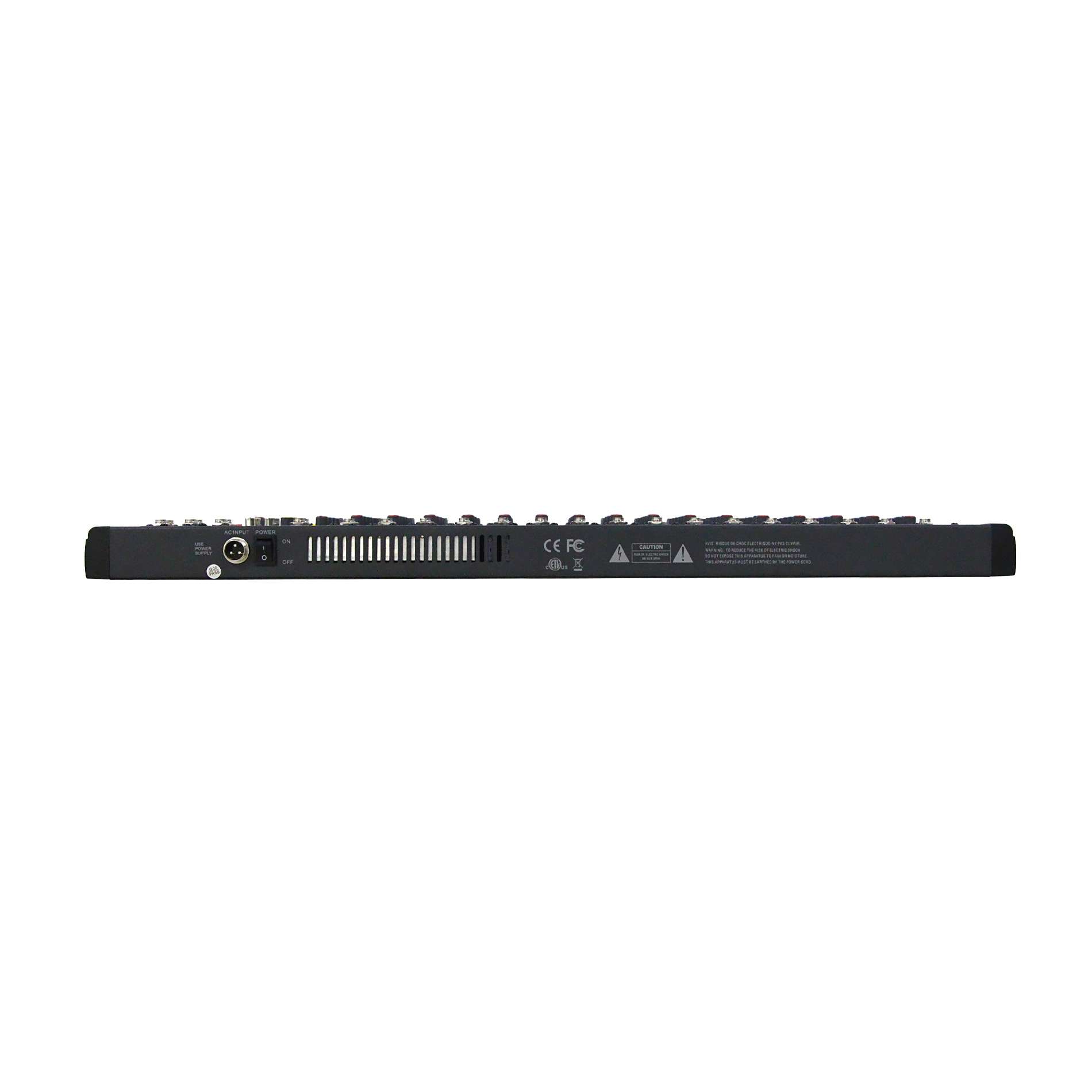 - Niveaux d’entrées et de sorties : Entrée Mic : +17 dBu max, entrée Line : +30 dBu max, entrée Stéréo : +30dBu max et sortie Mix : +20 dBu