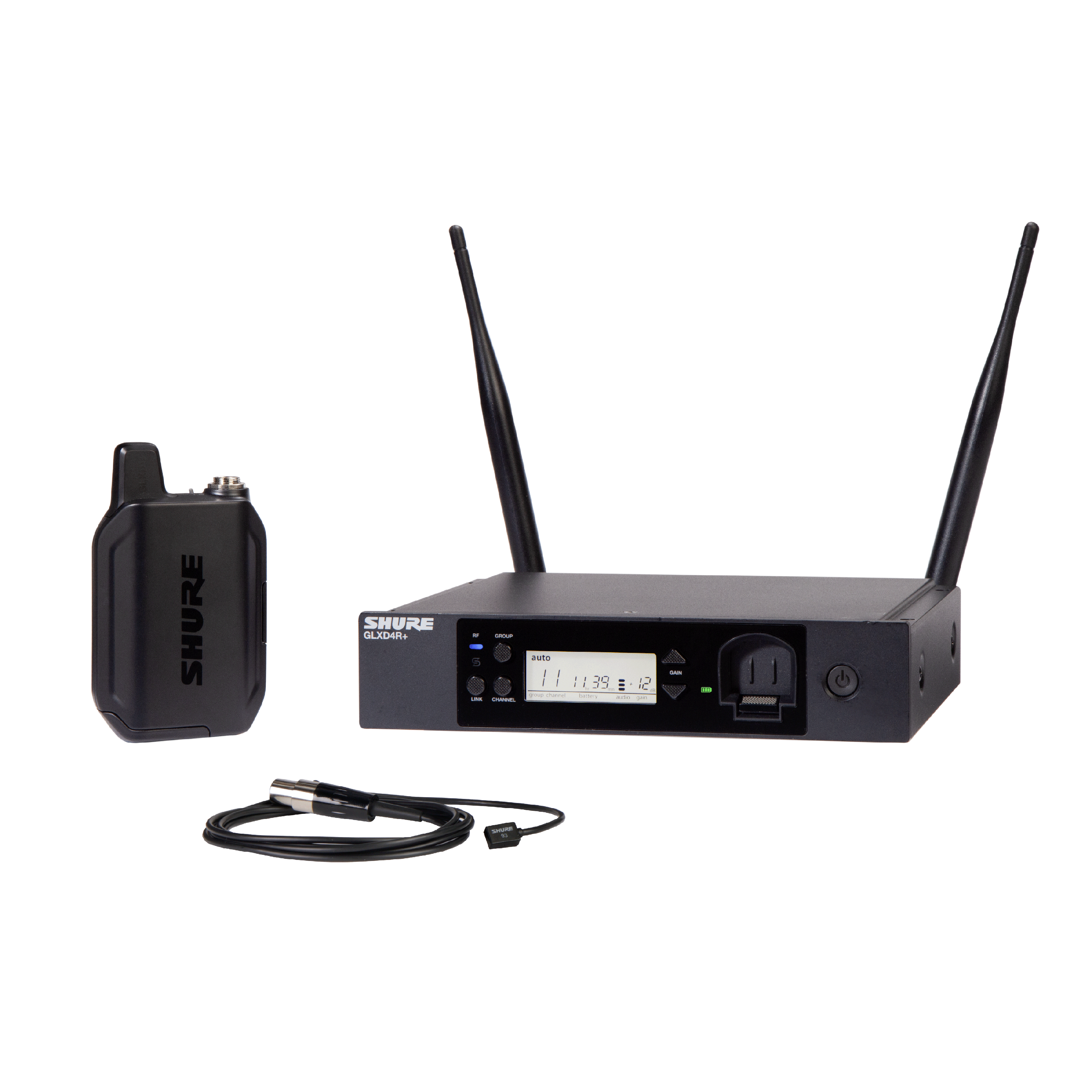 Récepteur double-bande GLXD+ rackable avec émetteur de poche et micro-cravate WL93.