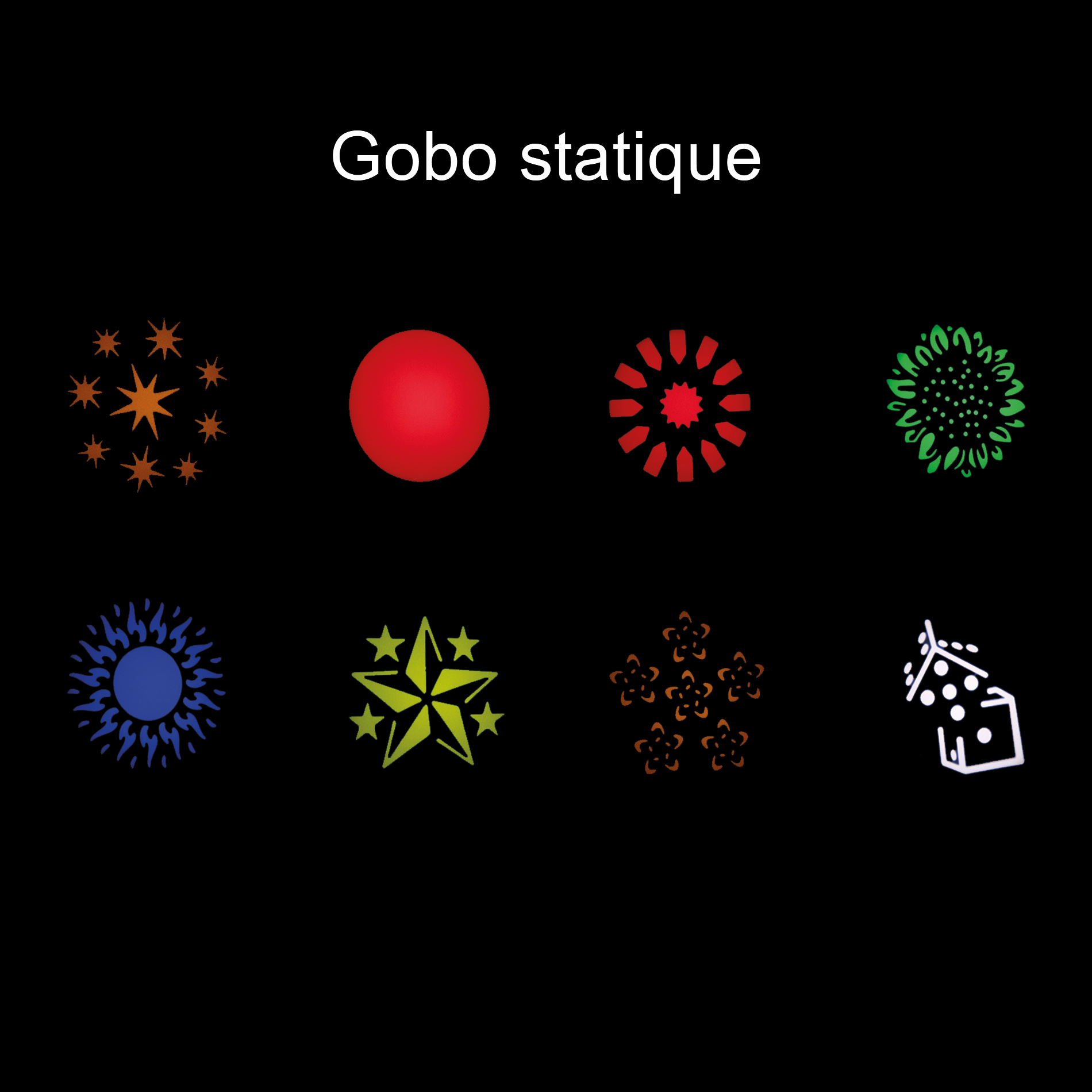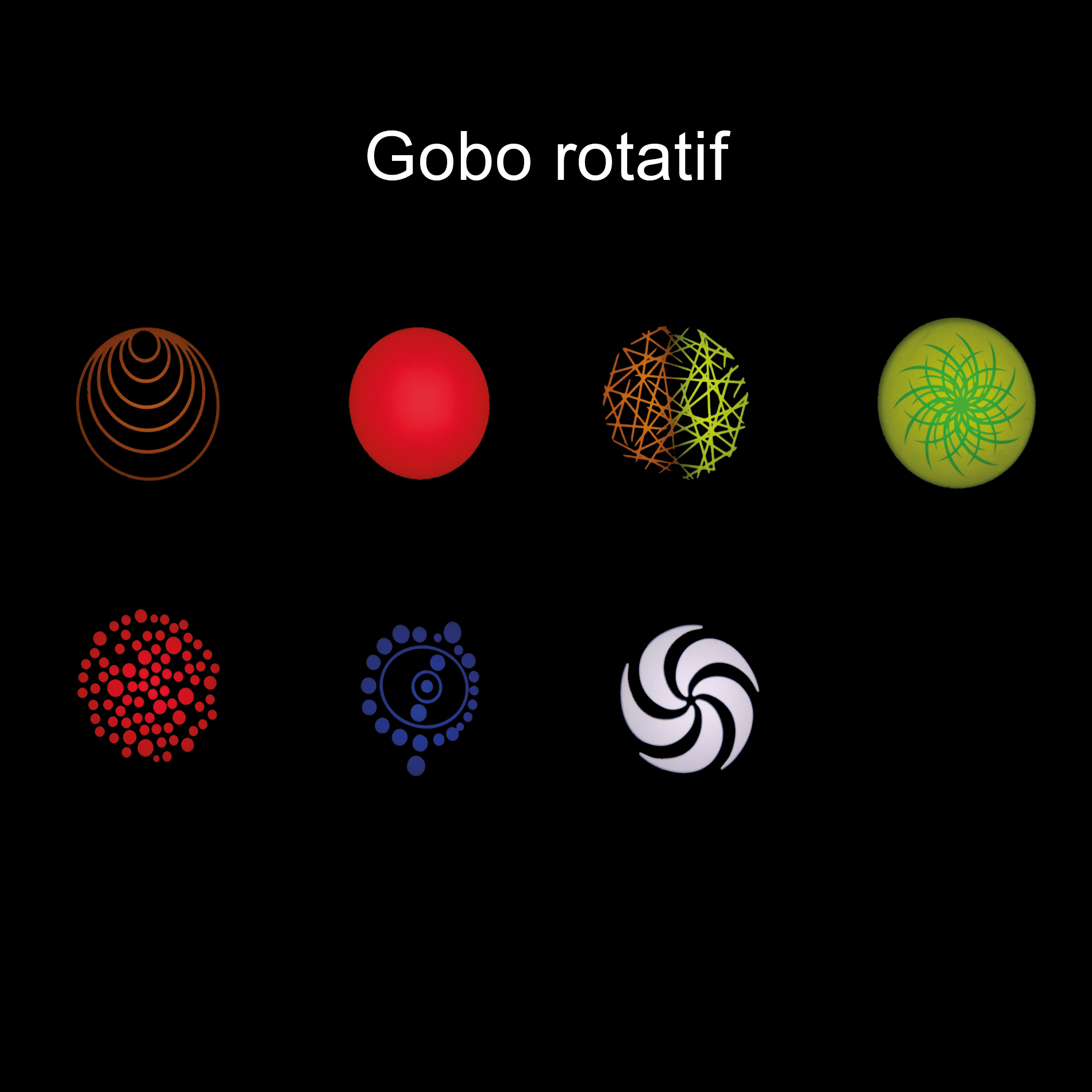 - 2 Roues gobos (7 Gobos statiques + Blanc et 6 Gobos rotatifs dont 1 en verre + Blanc)
