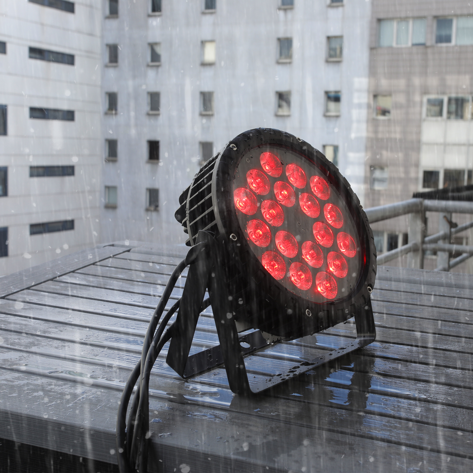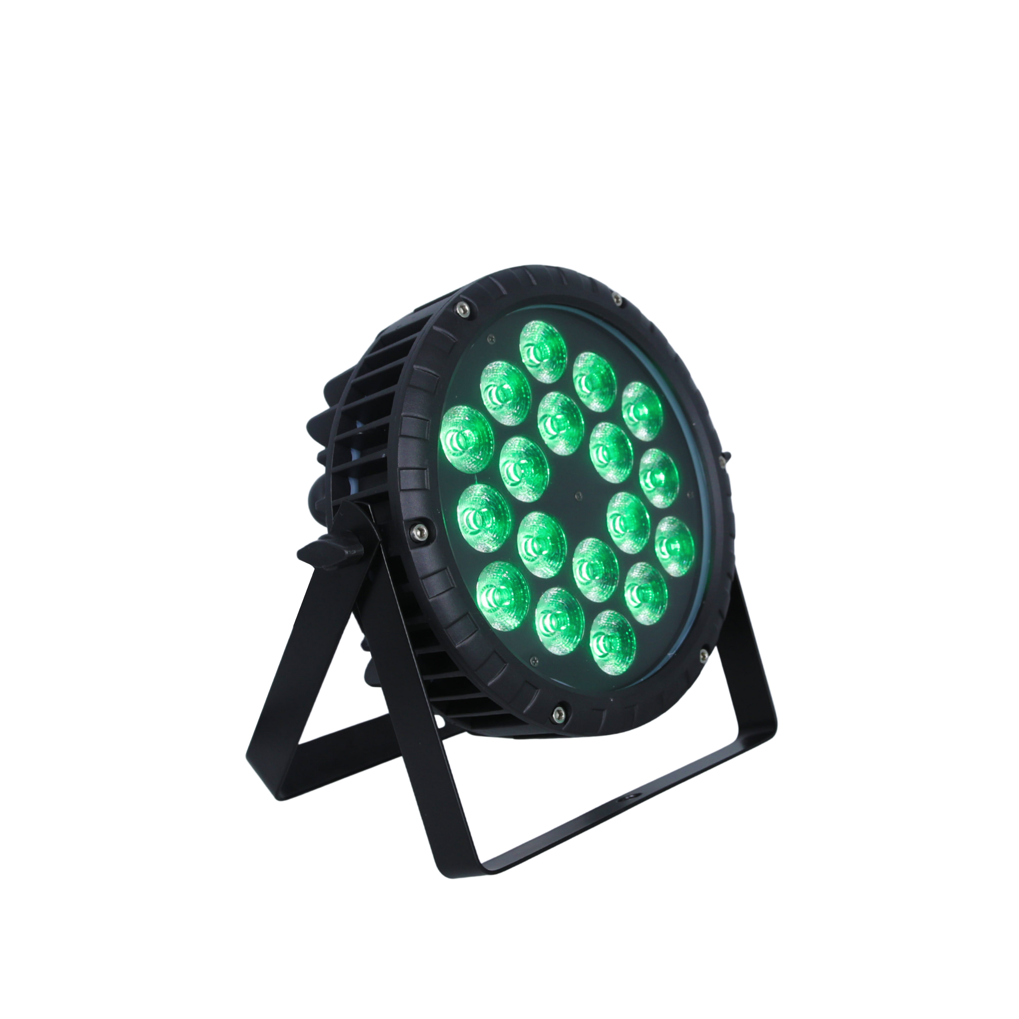 Projecteur IP65 de type Wash comprenant 18 LEDs de 12W 5-en-1 (RGBW+A). Coque en aluminium moulée robuste. Nouvelle technologie de gradation électronique (PWM) éliminant les scintillements. Utilisation en mode DMX, musical ou automatique.